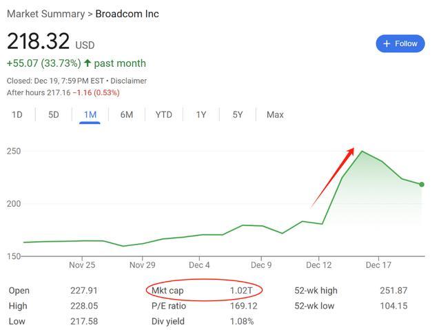 上周五,博通股价上周五单日飙升了24%,因为博通宣布其2024财年的AI收入激增220%,达到了122亿美元,公司的市值因此增加了2000多亿美元,首次突破1万亿美元的大关,成功跻身仅有8个成员的“市值超过1万亿美元的美国公司”俱乐部。